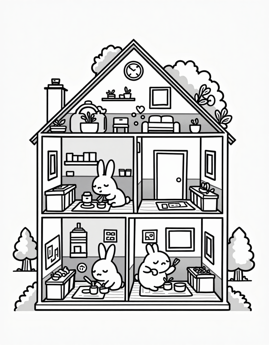 ✅ 8 printable bunnies at in their doll house home coloring pages